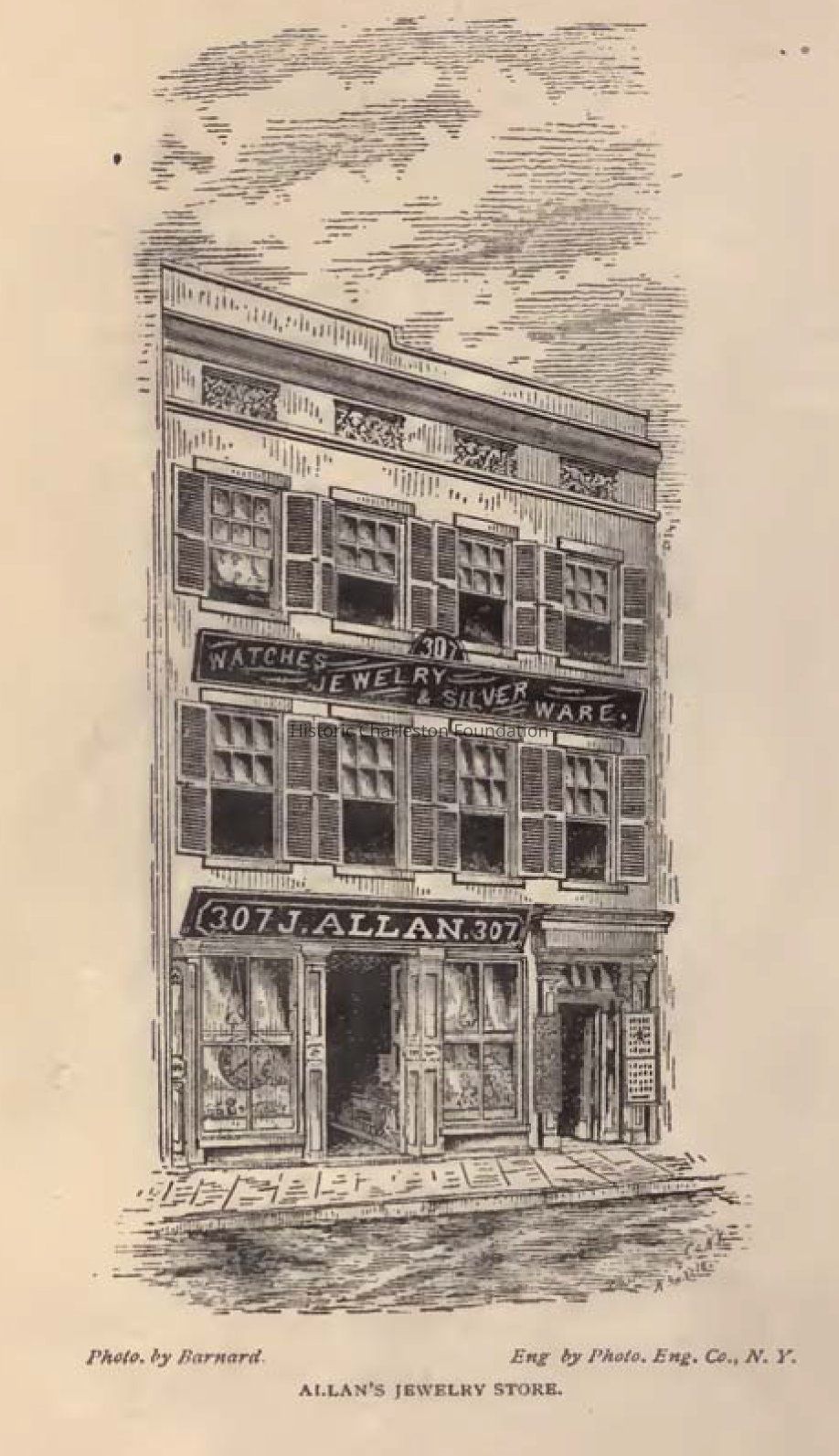 Photographic reprint of an 1875 engraving from Charleston Illustrated, showing the east (front) elevation. Occupied by J. Allan, watches, jewelry, and silverware, with the previous address 307 King Street.