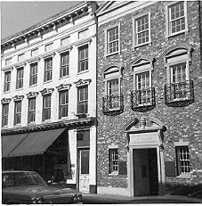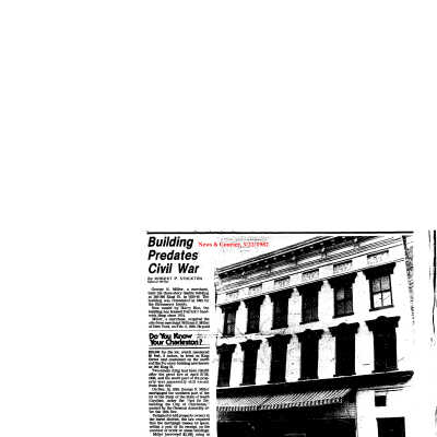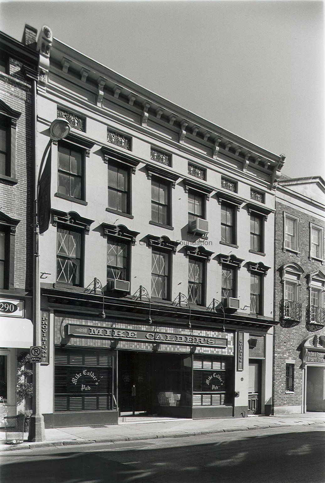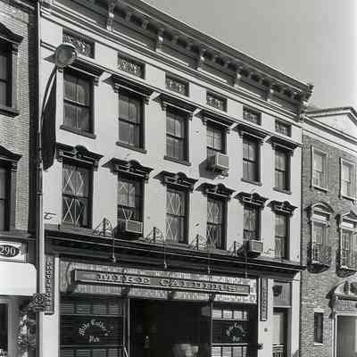 Constructed 1839-1840; altered 1883. Rebuilt after the fire of 1838 by merchant George N. Miller, the building was described in an 1853 conveyance to Thomas N. Gadsden as "a Three story Double Tenement Brick Store." The stuccoed brick Greek Revival building with 6 bays on each floor and a parapet decorated by cast-iron grills with anthemion motif was renovated after its purchase by John Henry Steinmeyer in 1883. The Steinmeyer family, owners of extensive properties in Harleston Village and a large lumber mill on the Ashley River near Gadsden and Beaufain Streets, added Italianate style pressed-metal window hoods and a bracketed cornice. Used as a dry goods store and drugstore the building retains its interior paneling, shelving, and drawers. (Poston, Buildings of Charleston.)