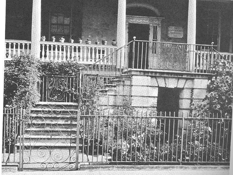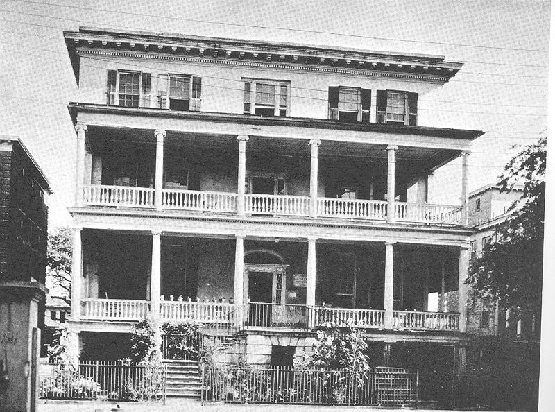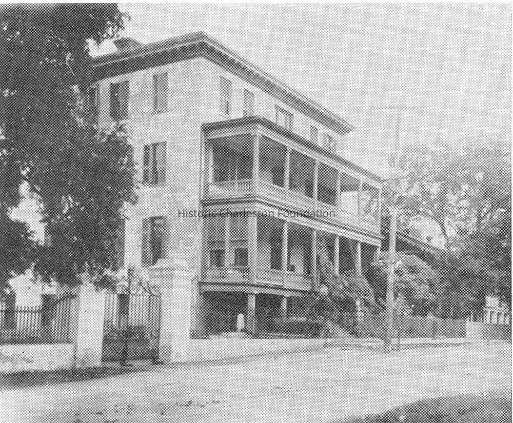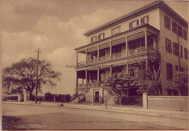 Jonathan Lucas, Jr., built this handsome house between 1803 when he purchased the site and 1809 when it is listed in a city directory. He bought from Daniel Cannon's estate in 1803 a tract of 83½ acres, which then contained one of Cannon's sawmills. Lucas built this house and a complex of rice mills on the tract. Lucas's heir, Edward S. Lucas, inherited the property and then sold it to David Jennings, a banker, in 1867. The City of Charleston purchased the property from Jennings in 1887 and in 1887-88 erected on the grounds at the corner of Calhoun and Lucas (now Barre) streets, the City Hospital. In 1893, the former Lucas residence was made a part of the hospital operations as the Riverside Infirmary for private patients. The City Hospital was replaced by the New Roper Hospital in 1904, and in 1921, the Thompson Memorial Hospital was built and the Riverside Infirmary became the R.A. Kinloch Home for Nurses. (In 1946, another New Roper Hospital was erected on the filled former salt mill pond to the west of the house, and the building at Calhoun and Barre was demolished.) The house is under the ownership of the South Carolina Medical Society. The house is an excellent example of Adamesque architecture. One of its most outstanding features is the elaborate main entrance, with its elliptical fanlight and profuse Adamesque decorations. The house has 3 full floors on a high basement. The top floor was rebuilt to its present appearance in 1959-60, following a fire. (City of Charleston Tour Guide Training Manual.)