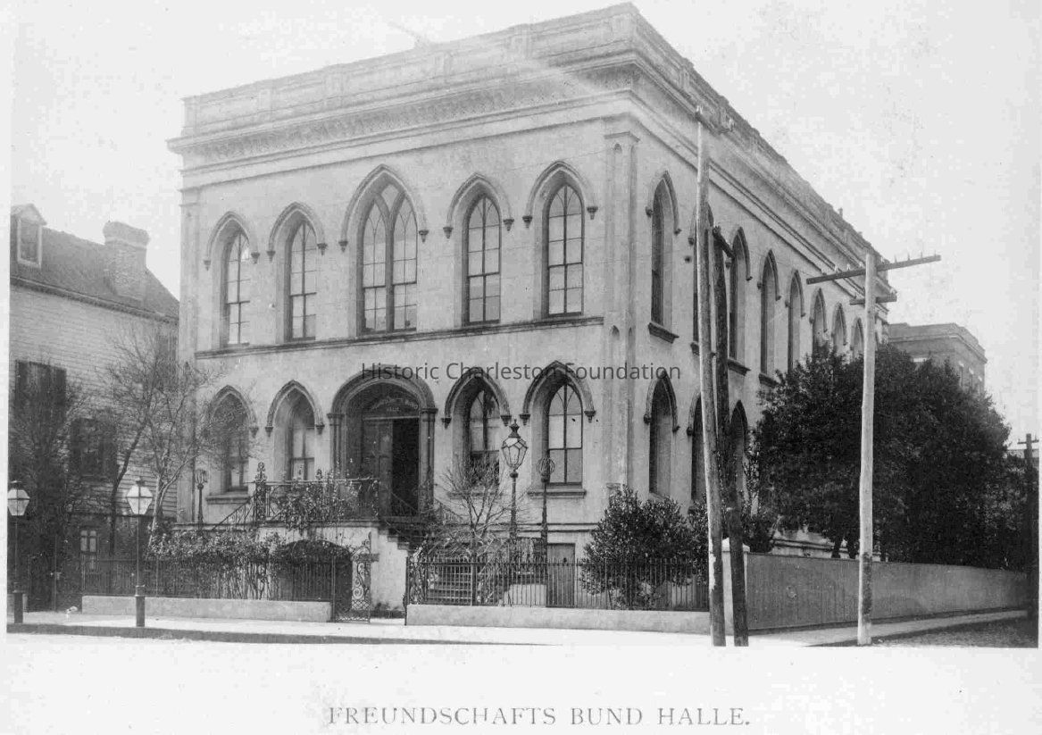 Constructed 1870; rehabilitated early-1980s. Abrahams and Seyle, architects. This 2-story Gothic Revival building stands on a raised basement at the intersection of Meeting Street and George Street. Formerly serving a German fraternal organization, it had a number of uses before being taken over in 1984 as the headquarters of the Washington Light Infantry, a local military unit, founded in 1807. It also served as a masonic temple. Lancet arched windows and parapet provide the major decoration for this large stucco building, partially enclosed by fencing from the old Radcliffe-King House and accessed by gates designed by Albert Simons for the Infantry in 1955, reflecting the unit's service in most wars since the War of 1812.