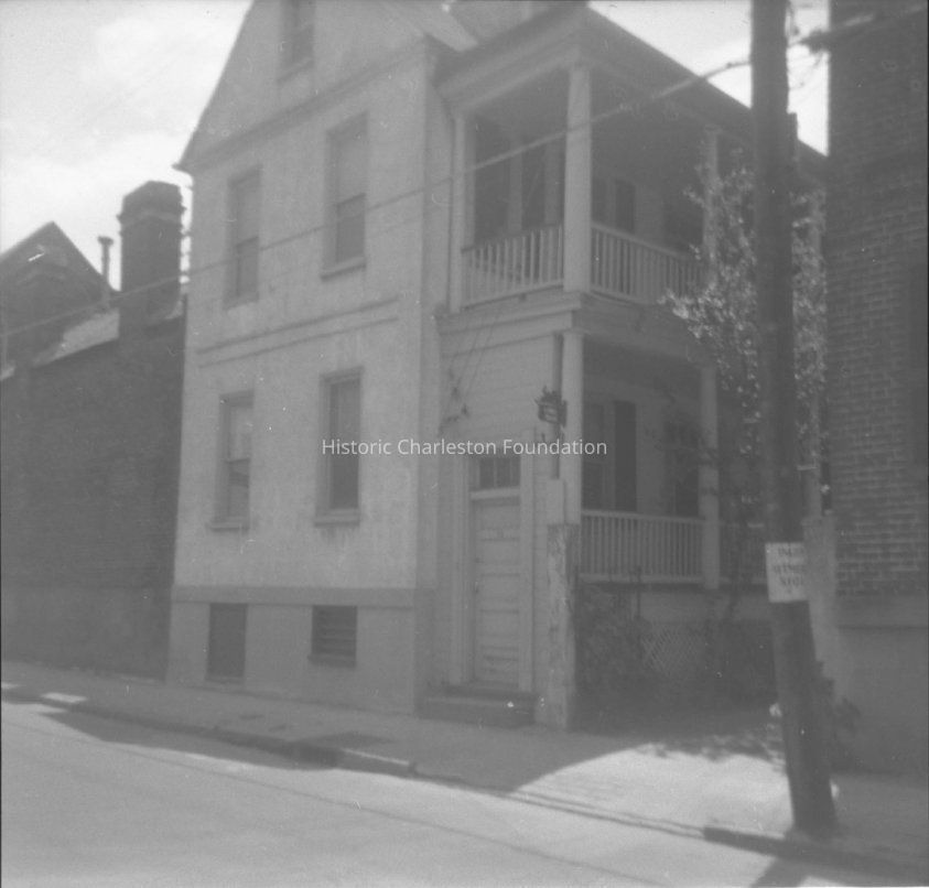 B&W photograph of 29 Hasell Street, corner view of house showing the norh (front) and west (piazzas) elevations.