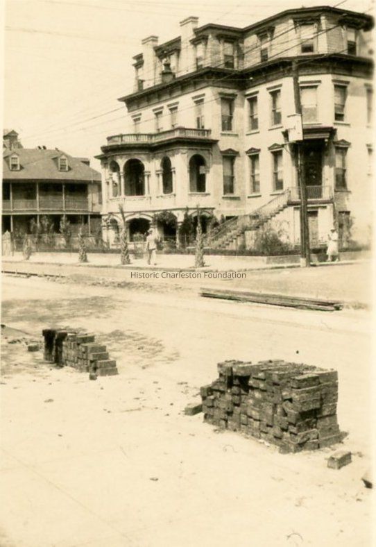 B&W photograph of 292 Meeting Street, which had been located at the northeast corner of Meeting and George Streets. South elevation of 294 Meeting Street at left. Two stacks of bricks from the grounds of the Washington Light Infantry headquarters building across the street in the foreground.Collection