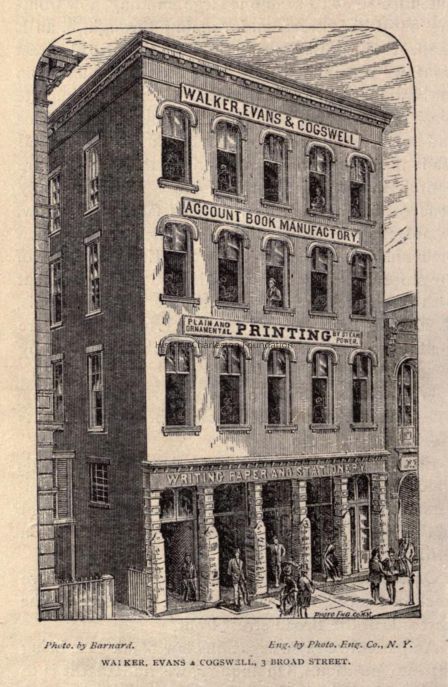 Constructed 1853-54; rehabilitated 1983-84. Edward C. Jones and Francis Lee, architects. This is an Italianate, Flemish-bonded brick structure with brownstone window heads and sills. It became the principal store of Walker, Evans & Co., stationers, engravers, and bookbinders, within 2 years of its construction by Edward Sebring, president of the State Bank next door. In 1856 it was joined at the rear to the firm's earlier headquarters at 117 East Bay Street. Both structures remained in use by Walker, Evans & Cogswell until 1982. The East Bay Street building, formerly a full 4 stories, boasts a post-earthquake deep pressed metal cornice and mansard roof. The structure at 3 Broad also lost its original brownstone cornice in the earthquake of 1886, after which a pressed tin cornice was added. From 1861-1865, the company relocated to Columbia and served as Confederate government printers.