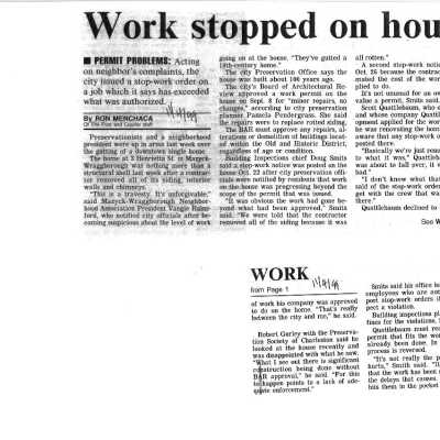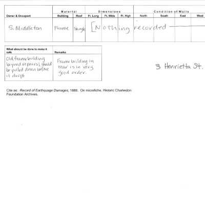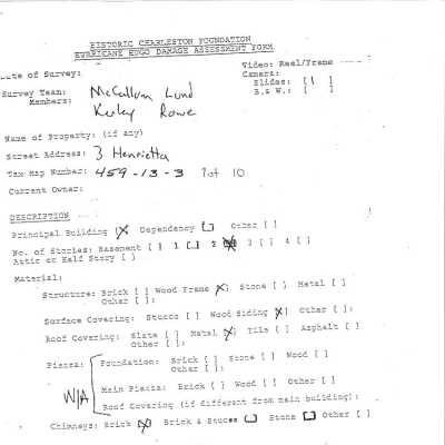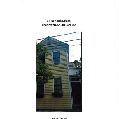 File contains graduate student report (Branden Gunn, 2017) on the history of the building/property, which includes historical and chain-of-title research, maps, photos, plats, and other supporting documentation; newspaper article unauthorized work done on the house; 1886 Earthquake damage assessment; Hurricane Hugo damage survey. (File also contains the 1886 Earthquake damage assessment for 1 Henrietta Street.)Collection