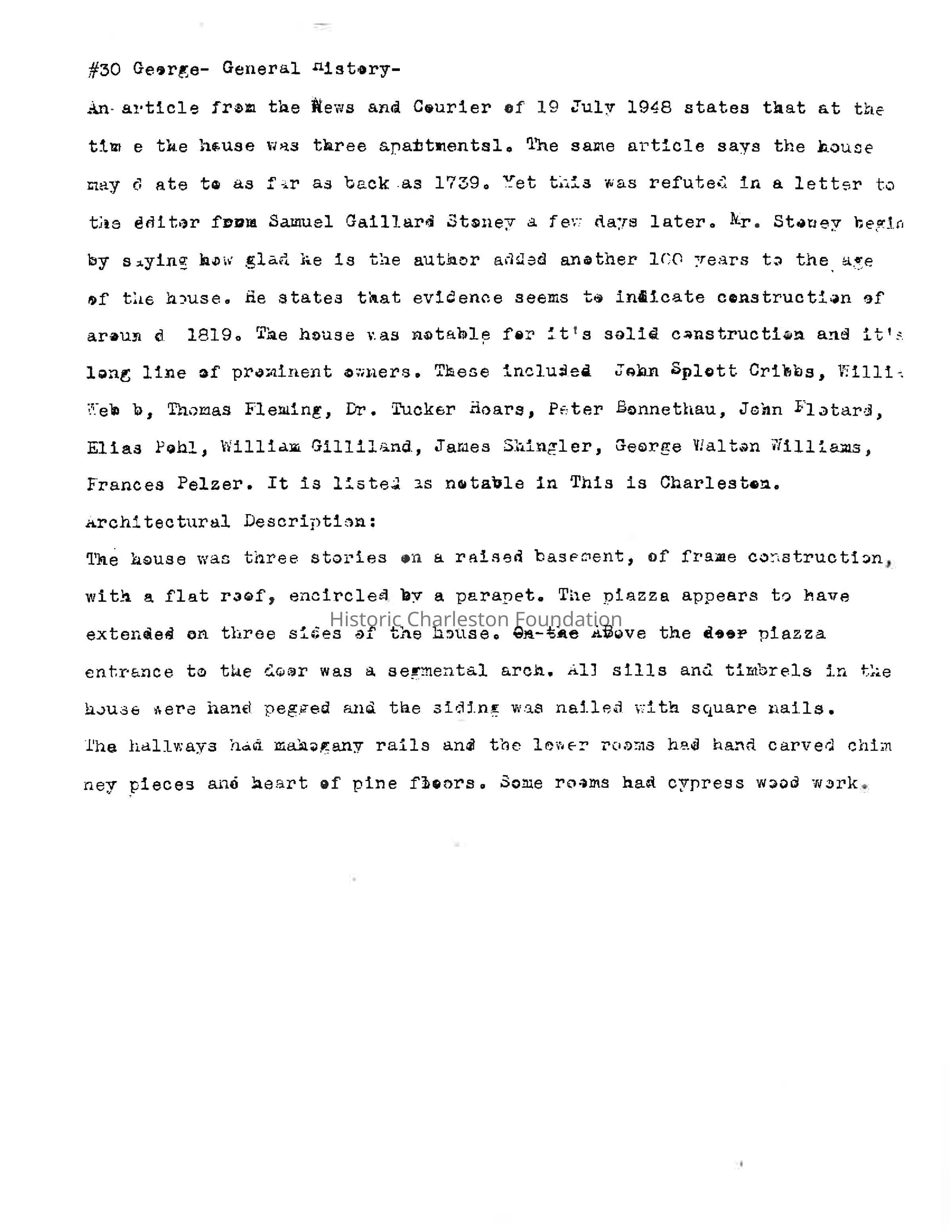 File contains narrative history (unattributed, undated) that references a 7/19/1948 News & Courier article.