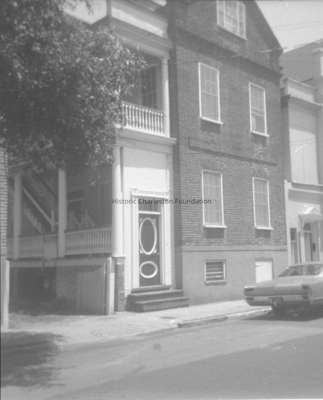 B&W photograph of 30 Hasell Street, corner view showing the south (front) and west (piazzas) elevations.