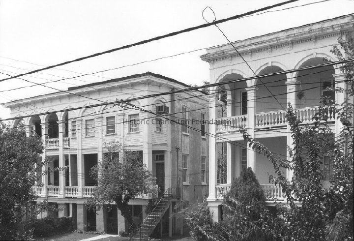 Constructed 1854. Attributed to Edward C. Jones, architect. Apparently planned as a portion of a four-to-six-unit row of dwellings, these Italianate villa-style houses may have been designed by Charleston architect Edward C. Jones, noted for using similar detailing in his design for Roper Hospital. Dr. Christopher G. White built the easternmost single dwelling, but upon default on his payments, it was acquired by a member of the Tobias family, which owned all three dwellings at the time of the Civil War. The house at 30 Montagu Street probably lost its interior during its conversion to three apartments in the early 20th century, but the houses at 32 and 34 Montagu Street have generally remained single family residences and have retained their original interior features. A cast-iron fence and a double gate with allegorical figures adorn the entrance into 34 Montagu Street. (Buildings of Charleston, Poston.)