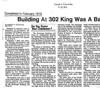 Constructed 1915-16. John Newcomer, architect. The architect John D. Newcomer designed this edifice for a building and loan company, and its construction was completed by 1916 at a cost of $13,000. Built of brick with a veneer of limestone, the upper floor with a semicircular window topped by a console bracket and a surmounting cornice supporting a roof balustrade derives from the Beaux Arts style. The Title Guarantee Building contrasts with the late Italianate style storefront added to a 1790s building at 300 King Street. The Onslow Candy Company added the surviving pressed-metal window hoods and the bracketed cornice. The arch with the bracketed keystone at the Title Guarantee Building, however, harmonizes with the surviving arched entry at 304 King Street. (Poston, Buildings of Charleston.)