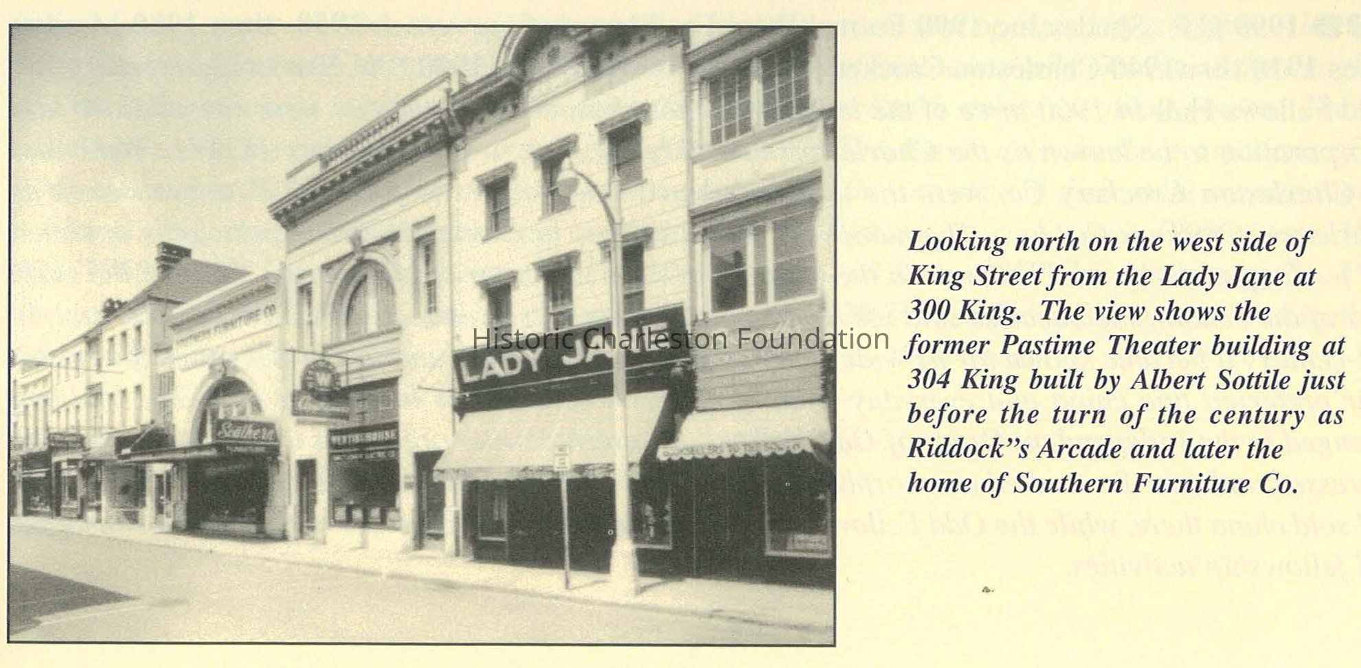 Built by Albert Sottile ca. 1898 and leased to Eddie Riddock who operated Riddock's Arcade, which served Charleston as a soda shop. When this business failed ca. 1911, Sottile announced plans to convert the facility to a movie theater, the Princess Theater. Surviving as a movie house exclusively, the Princess boasted a mirror screen and a five-piece orchestra for film accompaniment and intermittent entertainment. The console bracketed arch on this structure and the now-restored front interior remain from the Princess Theater. The building has housed many businesses including LeRoys and Southern Furniture. (Poston, Buildings of Charleston.)