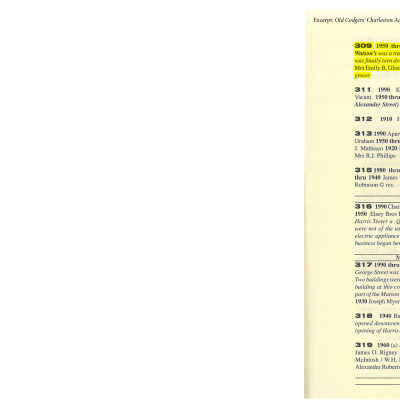 File contains occupancy history (20th c.) from The Old Codgers' Charleston Address Book; newspaper article (1972) about the BAR's approval of the demolition of the building located at 309 East Bay Street; documentation about HCF's purchase of the property (including 305 East Bay), which later became the sites for the current 39, 41, and 43 Laurens Street.