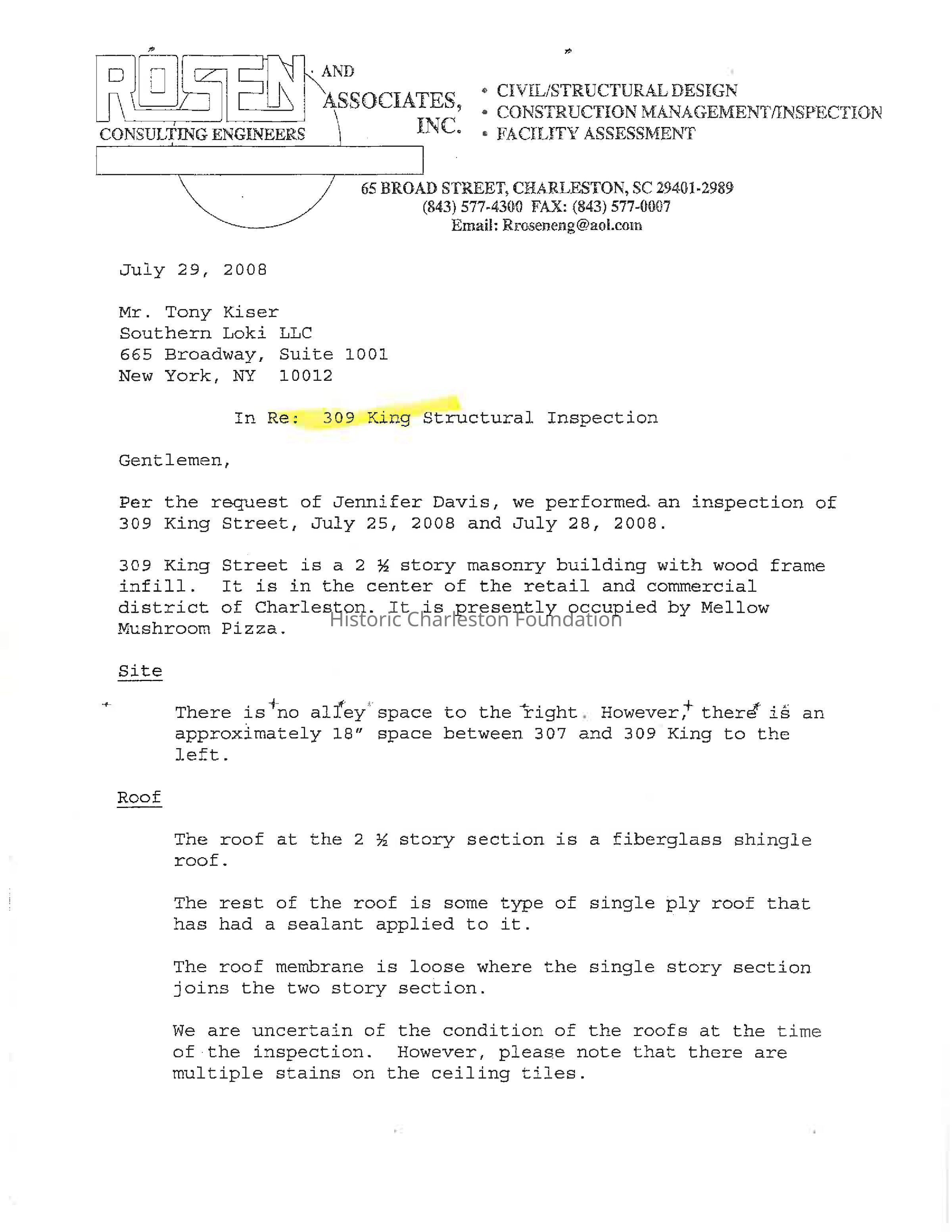 File contains Rosen and Associates (engineers) inspection report (2008).