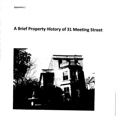 File contains graduate student report (Leah Applewhite, 2019) on the history of the house, which includes historical and chain-of-title research, maps, photos, and other supporting documentation; College of Charleston Candelight Tour garden history (1979); draft of other narrative history (Craig M. Bennett, undated); brief article from 1958 Preservation Progress (with photo); news article (EP, 8/6/1968).Collection