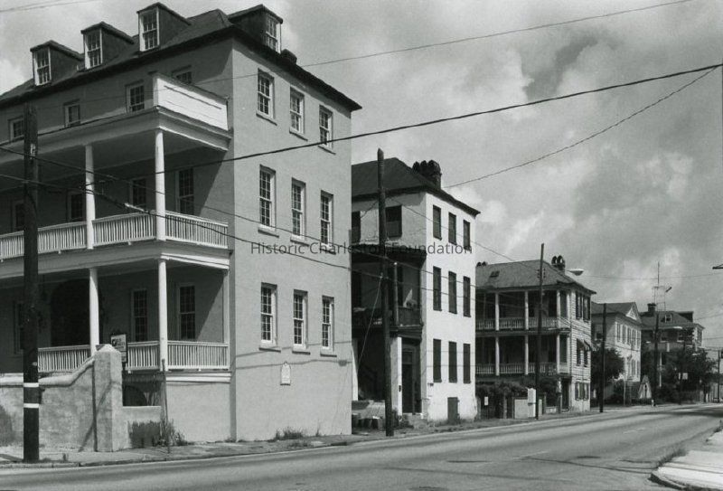 B&W photograph of the view looking north on East Bay Street from the Stephen Shrewsbury House (311 East Bay) to 329 East Bay Street. Also shows 313 East Bay, 317 East Bay, and 321 East Bay.Collection