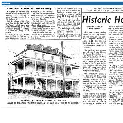Constructed ca. 1809; rehabilitated 1971; restored late-1980s. Another important Federal doorway surmounted by an elliptical fanlight provides the main entrance for this tall masonry dwelling at the corner of East Bay and Laurens Streets. Stephen Shrewsbury, member of a family of shipwrights and himself a carpenter, rose to be clerk of the South Carolina Bank by 1796 and acquired this lot in 1800 from a grocer. By 1809 he had completed this house and moved to the site. Used for many years as an office, it is again a single family dwelling, although the former kitchen dependency, now 42 Laurens Street, was subdivided and renovated as a separate residence. (Poston, Buildings of Charleston.)