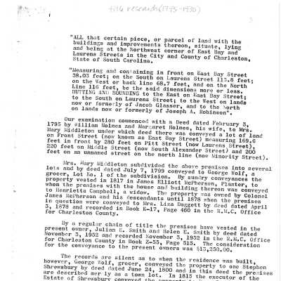 Three files contain covenant on the property; correspondence related to the covenant; documentation of the sale of the property; annual inspection reports; requests for alterations; correspondence and other documentation related to the management of the property; title research (1795-1930); house history from Information for Guides of Historic Charleston; copy of HCF easement information card (TMS number, year of construction, significant resident(s), deed research, deed restrictions, measurements, and tax information).