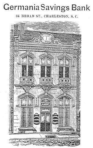 File contains brief building history from Information for Guides of Historic Charleston; copy of advertisement with illustration from "Resources & Attractions of Charleston" (ca. 1898) of the Germania Savings Bank.