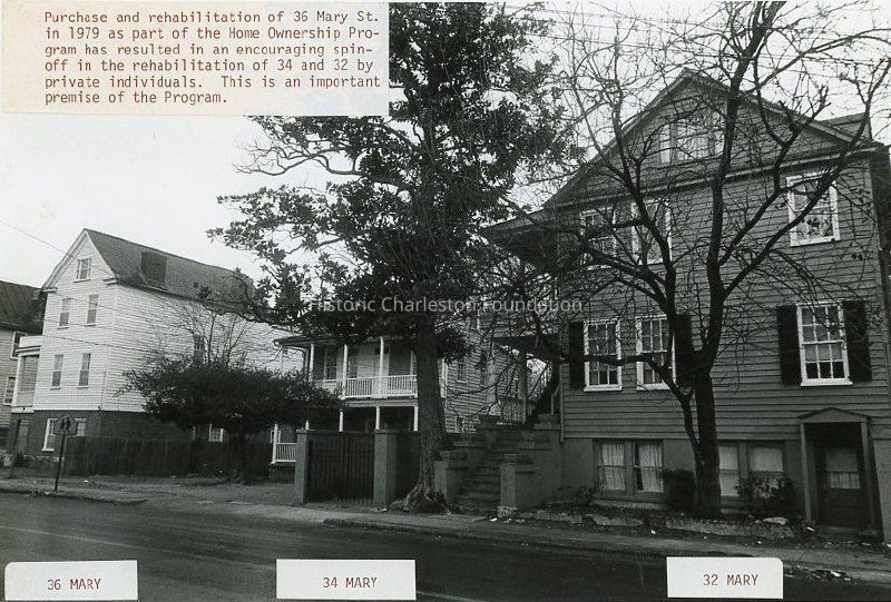 B&W photograph of 32 Mary Street after rehabilitation, 34 Mary Street, and 36 Mary Street, south (front) elevations. Photo is captioned "Purchase and rehabilitation of 36 Mary Street in 1979 as part of the Home Ownership Program has resulted in an encouraging spinoff of the rehabilitation of 34 and 32 by private individuals. This is an important premise of the Program."Collection