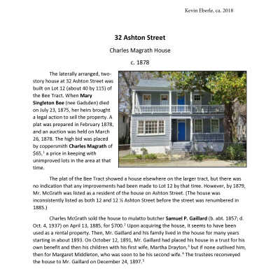 Constructed ca. 1878. The laterally arranged, two-story house at 32 Ashton was built on Lot 12 of the Bee Tract, property that had been owned by Mary Singleton Bee. The property was sold to Charles Magrath in 1878. By 1879, Magrath was listed as a resident of the house on Ashton Street then known as 12 Ashton but renumbered in 1885.
