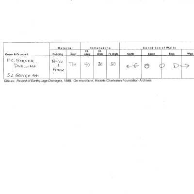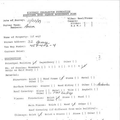File contains house history from Information for Guides of Historic Charleston; newspaper article (DYKYC); 1886 Earthquake Damage Assessment; Hurricane Hugo Damage Survey.Collection