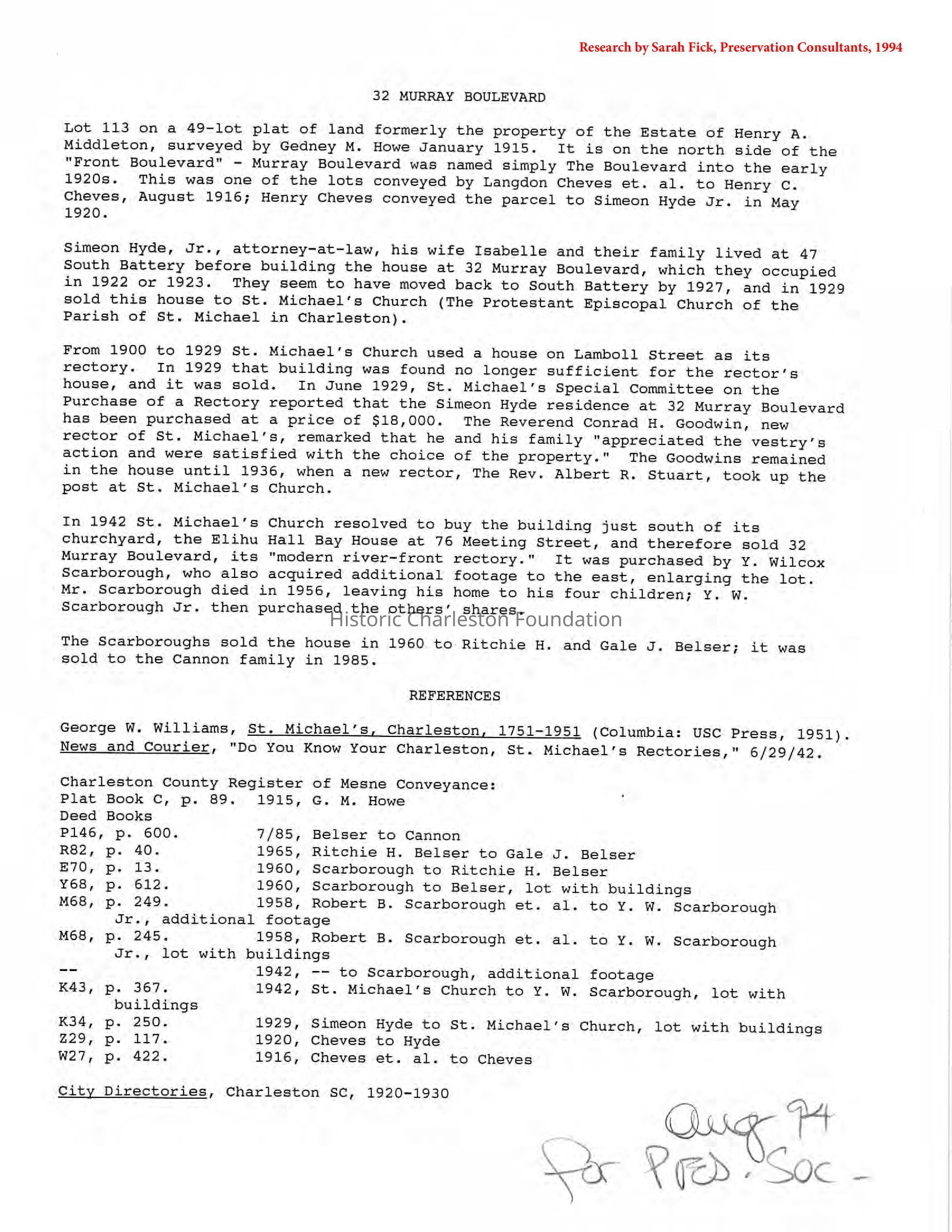 Simeon Hyde, Jr., attorney-at-law, his wife Isabelle and their family lived at 47 South Battery before building the house at 32 Murray Boulevard, which they occupied in 1922 or 1923.