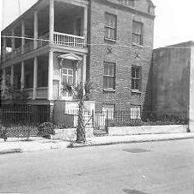 b: Palmetto tree in front; shows portion of rear of 30 Society Street/297 East Bay/299 East Bay. Sales information handwritten on back: "2½ story brick and large kitchen building. No more than two living units. 50' x 114' deep. $13,000."Collection