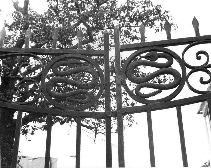 Constructed ca. 1800; partially restored 1960. One of the tallest and most finely detailed of Charleston's Federal single houses, this house was built after 1798 on land formerly owned by Christopher Gadsden. Although traditionally called the Gadsden House, the building was probably built by Thomas Morris, a Gadsden son-in-law whose name appears on the lot on the 1790s map of this portion of Middlesex; Philip Gadsden is shown on the same map as living at 328 East Bay Street. The property had subsequent owners of prominence, including Col. Elnathan Haskell, a Revolutionary War hero; Dr. Benjamin Bonneau Simons, an outstanding medical practitioner; and, after the Civil War, the Right Reverend W. B. W. Howe, Episcopal bishop of South Carolina. The building has fine brickwork as well as important carved marble keystones, window sills and door architrave, along with surviving Neoclassical wooden elements. The present iron gates were designed in collaboration between Samuel G. Stoney, architectural historian, and Philip Simmons, noted Charleston ironworker. The gates remain one of Simmons's most important works. This house was given to Historic Charleston Foundation by a Gadsden descendant in 1959. (Poston, Buildings of Charleston.)