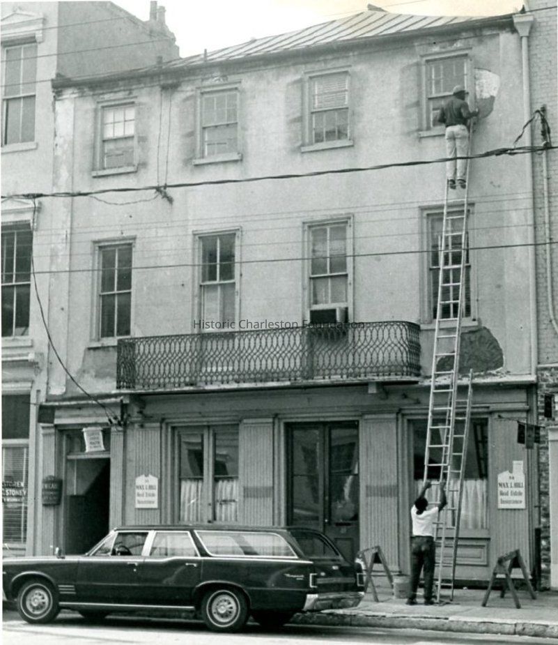 B&W photograph of 33 Broad Street (John Smith House and Office), street (front) elevation. Office of Max I. Hill Real Estate/Insurance. Building is undergoing repairs. Man at top of a ladder makes masonry repairs while another one braces the ladder below. Car parked in front of building.Collection