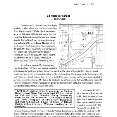 Constructed ca. 1839-1848. The house at 33 Hanover Street is a simple worker's residence built on a portion of a tract of land owned by Richard Dereef. Dereef sold the half of the tract that fronts Hanover Street to Edward Baxter, a free Black man, in 1839.