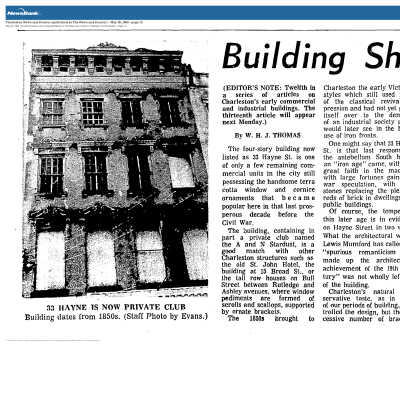 File contains occupancy history from Old Codgers' Charleston Address Book.; 1-page photocopy of drawings of the building's columns and brackets by Ronald W. Ramsey (1990) in which it is indicated that the building survived Hurricane Hugo but was torn down in 1990; newspaper article (DYKYC, 1969).