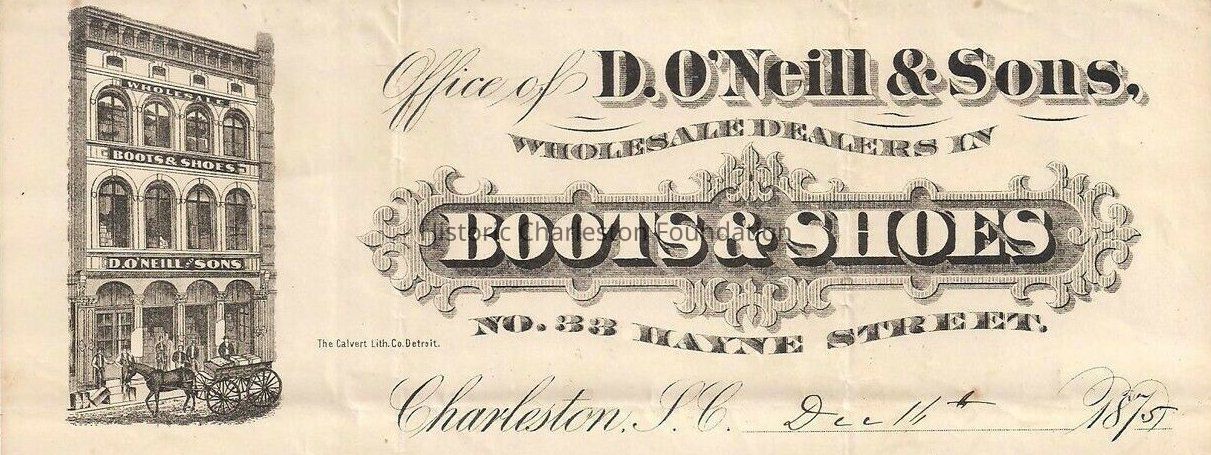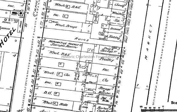 Dating from the 1850s, this building four-stories with terra cotta windows and cornice ornaments that became popular in Charleston in the years prior to the Civil War. The ground level had a true iron front, possibly a post-war addition, and the engaged columns with Corinthian capitals, the consistent bracketed entablature flanked by the faces of maidens, were a true reflection of the period. It served a variety of purposes over the years: O'Neill & Sons Boots and Shoes, Thompson-Miller Hardware Company, the facilities for the Geer Drug Company, Corvette's Refrigeration Company, Charleston Lithographing Co, and the Startles Club. It was also vacant for several years at a time. The building survived hurricane Hugo in 1980 but was torn down in 1990. (Stockton, 1969; Ramsey, 1990.)