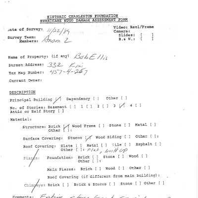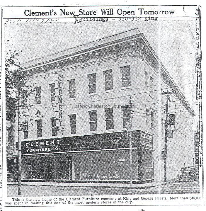 File contains report on the history of the property including chain-of-title; newspaper article (1940) about the opening of Clement Furniture Co.; description of 20th century occupants from Old Codgers Charleston Address Book; 1886 earthquake damage assessment surveys. (Hurricane Hugo damage assessment survey on Media tab.)