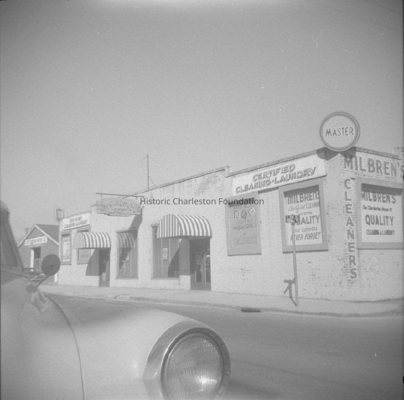 B&W photograph of 334 East Bay Street, Milbrens Cleaners, west (front) elevation. Also partially shows the corner (southwest elevation) of the building. A variety of signage for the laundry is on the building. 336 East Bay Street can be seen in the background (at left of photo). Headlight of car in foreground.