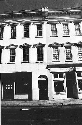 Constructed after 1794. The merchant John Cunningham purchased this site in 1794 and probably built the present 3-story double building within the first decade of his ownership. This stuccoed brick Federal style building has a common facade on the upper floors, and its rear yards were formerly accessed through the common central archway, although the buildings are now two separate parcels as a result of a court order in 1879 in the settlement of debts of Mrs. Sarah Ottolengui, a later owner. Jacob Capel purchased 336 King while Dorothea Blohme bought 338 King Street, both renting to a myriad of tenants including David and Epstein, jewelers and watchmakers; Charle Holle, barber; Cable Piano; and None Such Lunch. The 1940s brought such lessees as the Arcade Shooting Gallery, the Barn Tavern, and Bert's Locker Club, reflecting changing uses. Throughout the pre-World War II history of the site, most of the commercial tenants lived upstairs. The Italianate style cornices with side brackets and the pedimented window hoods probably date from the years immediately before 1879. The former feature obscures the hipped roof dating from the late-19th century. These later details and the double form reflect the same pattern as the smaller, 2-story double building across the street, 337-339 King Street, built by the baker Henry Dorre in 1859 and subsequently divided into separate properties.