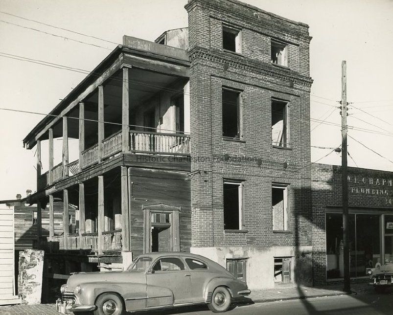 B&W photograph of 339 East Bay Street, east (front) elevation. Likely taken soon before the building was demolished. Portion of the neighboring building, 341 East Bay Street (M.L. Chapman Plumbing) at right. Car parked in front of building.Collection