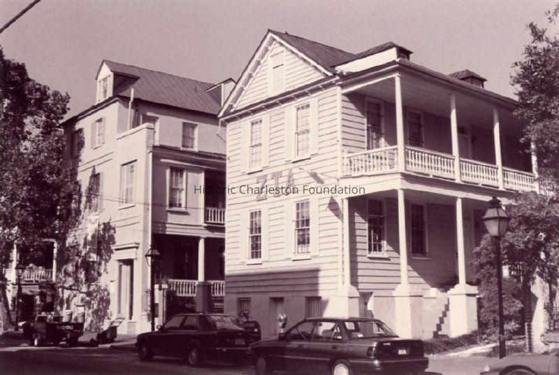 34 Coming Street may date from the Revolutionary period but its Queen Anne style closed gable and remodeled piazza entry belie its early date. Constructed by the vintner Thomas Harvey, the property originally contained a separate brick distillery building. The only masonry example of the group of sorority houses at 28-38 Coming, is the Graves House at 36 Coming Street. It was built in the 1840s by a wealthy planter who again leased the site from the glebe. Standing 3½ stories on a raised basement, the house retains its Greek Revival piazza door screen and an unusually wide dormer with a tripartite window projecting from its hipped roof. (Poston, Buildings of Charleston.)Collection