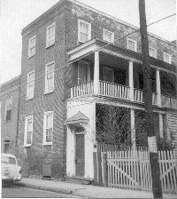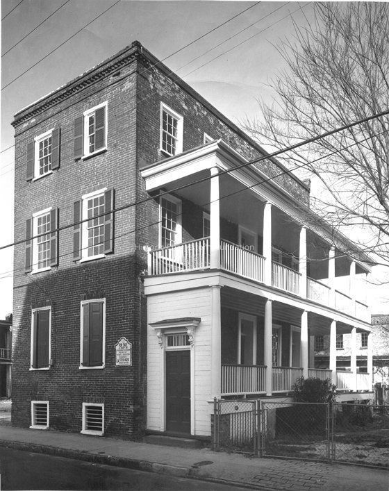 B&W photograph of 34 Anson Street (Mary Lanneau House) after rehabilitation. Street elevation, corner view. Sign on house: "For Sale, A Part of Ansonborough Rehabilitation Project of Historic Charleston Foundation." "Exterior Restored" written on verso of photo.Collection