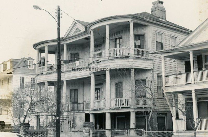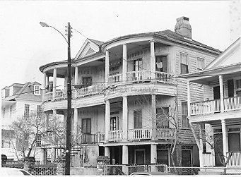 B&W photograph of 34 Chapel Street (Anthony Vanderhorst Toomer House, II), street (front) elevation. Also shows houses on either side.Collection