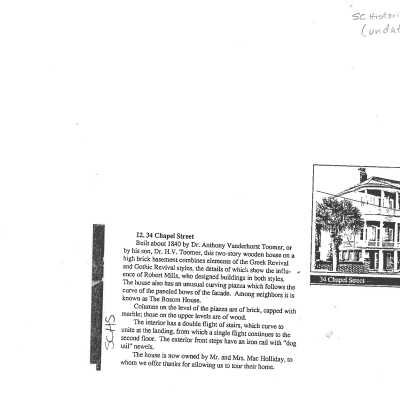 File contains SC Historical Society tour history; house history from City of Charleston Tour Guide Training Manual (2011); history from Architectural Guide to Charleston (by Simons & Thomas); HCF staff research notes; newspaper articles (1975 & 1984 DYKYC); 1886 Earthquake damage assessment; Hurricane Hugo damage assessment (see Media tab); correspondence (1979) about the possible purchase of the house by HCF.Collection