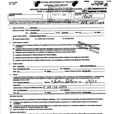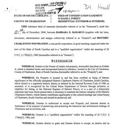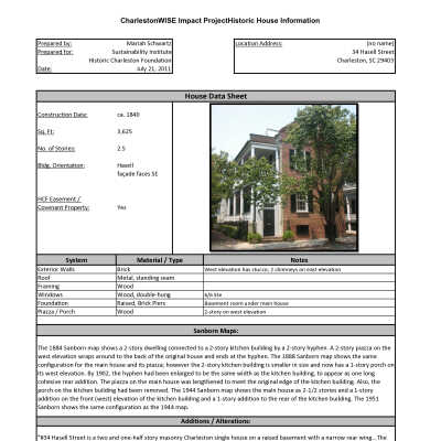 Three files contain documentation of the easement on the property including related correspondence and Confirmation of Understanding; Part I certification (National Register); easement appraisal report and IRS form 8283; annual inspection report; correspondence relating to management of the property; data sheet for CharlestonWISE Impact Project (Sustainability Institute) that includes construction date, square footage, number of stories, building orientation, system materials/types, Sanborn Map research notes, and additions/alterations notes (Mariah Schwartz, 2011).