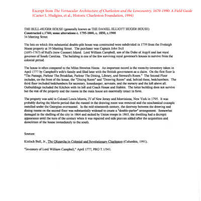 Constructed ca. 1760; some alterations ca. 1795-1800, ca. 1850, ca. 1900. The lots on which this substantial double-pile house was constructed were subdivided in 1759 from the Eveleigh House property at 39 Church Street. The purchaser was Capt. John Bull (1693-1767) of Bull's (now Coosaw) Island. The Bull dwelling, rented by Lord William Campbell in 1775, is one of the few royal governors' houses to survive from the colonial period. A room-by-inventory was taken in April 1777 by Campbell's wife's family and filed later with the British government as a claim. On the first floor was "The Passage, Parlour The Breakfast, Parlour The Dining, Library, and Steward's Room." The second floor included, on the front of the house, the "Dining Room" and "Drawing Room" and, behind these, bed chambers. The third floor included bed chambers for secretary, housekeeper, servants, and the nursery, with the loft above all. Outbuildings included the kitchen with its loft, coach house, and stables. The latter building does not survive, but the rest of the property and the rooms in the main house are essentially intact. Somewhat damaged in the shelling of the city in 1864 and sacked by Union troops in 1865, the dwelling was eventually repaired. It was sold in 1795 to the Morris family and in 1818 to Francis K. Huger. As of 1997, his descendants occupy it to the present day. (Poston, Buildings of Charleston.)