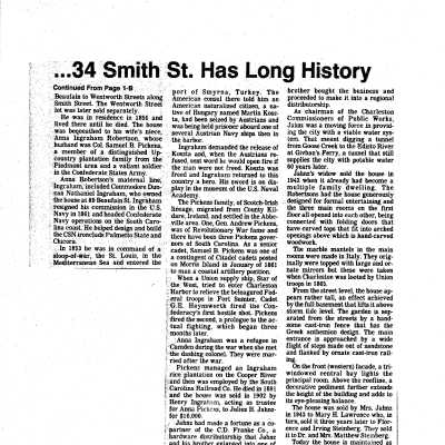 File contains newspaper article (1983 DYKYC); captioned newspaper photograph of Jahnz family in front of house (1912); house history from Information for Guides of Historic Charleston (1984).Collection