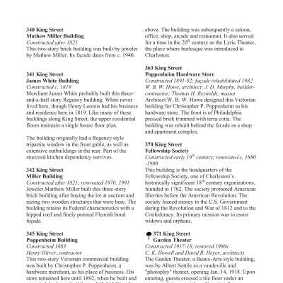 Constructed after 1821; renovated 1970, 1991. This building retains its Federal character with its hipped, slate roof and finely pointed Flemish bond facade, divided by belt coursing and 3 bays with 9-over-9 windows surmounted by rubbed brick jack arches. Miller, a jeweler, replaced 2 earlier wooden buildings on the site after buying it at auction in 1821; he retained it until his death in 1840. Although the upper floors of 342 King have remained as built, the small 2-story structure at 340 King Street was refaced in the 1940s in a late-Moderne fashion with molded bands of vertical concrete and a merlon in the stepped parapet. The brick form and fenestration are similar to that of the early-Greek Revival store and dwelling at 348 King Street, built by the Santo Domingan refugee Margaret Gidiere for her dry goods store and residence in the 1830s. This latter structure was held by numerous owners, including the German tavern keeper John Schachte. It later served as the Lyric Theater, the place where burlesque was introduced to Charleston, and eventually provided the venue for a series of discotheques and bars.