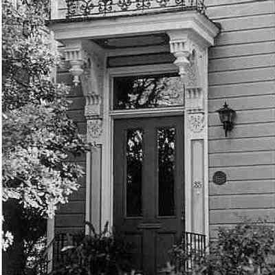 b: Doorway and window, featuring cast-iron detailing that surmounts the entry hood and bay window.