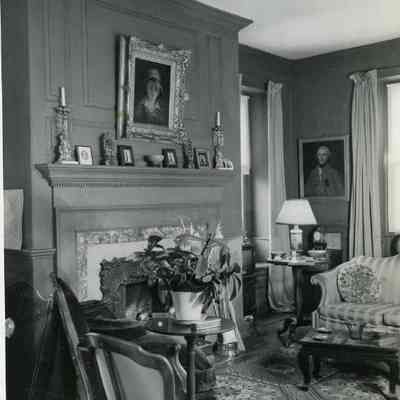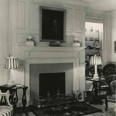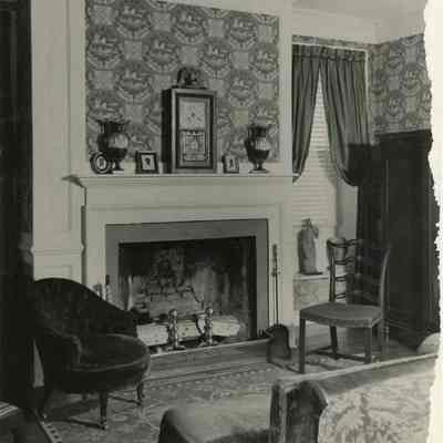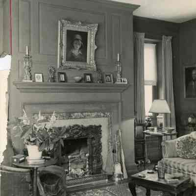 b: First floor living room fireplace. A note taped to the back indicated that "the windows at the sides of the fireplace have been made into china cabinets."