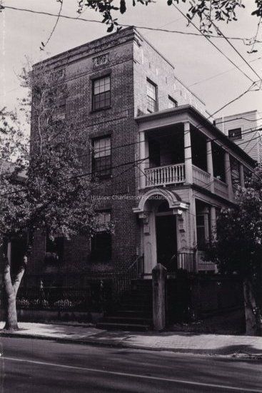 B&W photograph of 35 Hasell Street (John McNellage House), corner view of house showing the north (front) and west (piazzas) elevations.