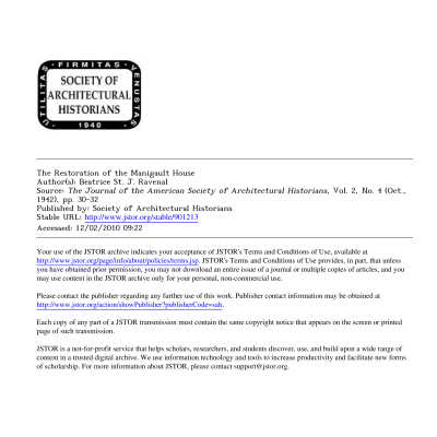 File contains narrative history (undated, unattributed); article "The Restoration of the Manigault House" by Beatrice St. J. Ravenel (1942); interior finishes analysis by George T. Fore (1991); newspaper articles; plat showing site layout and floor plan (photocopy); drawing of the front and work yards showing excavation units; article "Growing History" by Elizabeth Long (Joseph Manigault House garden) (source, date not indicated); paint research in ballroom (letter from HCF, 1985).Collection