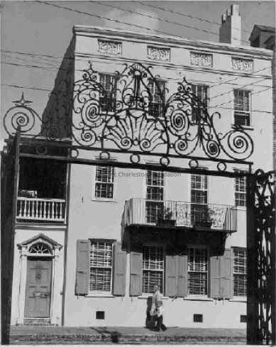 Formerly the location of late 18th century wooden tenements, the site of 34-38 Chalmers Street was purchased in 1816 by the owner of the adjacent property, Dr. William Wightman. Wightman left these properties to his free black daughter Jane Prevost (Wightman). After a fire in 1835, Miss Wightman built the house at 36 Chalmers Street as her residence. A 3-story, stuccoed brick Greek Revival style building, it was purchased and renovated in the 1930s by noted Charleston novelist Josephine Pinckney. Although the flat parapet and cast-iron grilles with anthemions are clues to the residence's Greek Revival past, Miss Pinckney, with the help of architect Albert Simons, added the Colonial Revival style piazza screen to the existing porch along with a wrought-iron balcony formerly used on a house that was demolished at 108 Meeting Street.