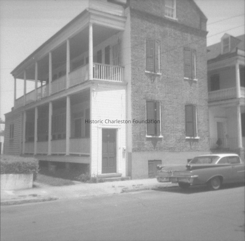 B&W photograph of 36 Hasell Street, corner view of house showing south (front) and west (piazzas) elevations. Car parked on street in front of house.