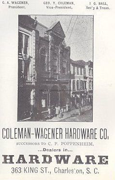 Constructed 1891-92; facade rehabilitated 1982. W.B.W. Howe, architect; J.D. Murphy, builder-contractor; Thomas H. Reynolds, mason. The son of an Episcopal bishop who designed the Drayton House at 25 East Battery and the William Enston Home complex at 900 King Street executed the plans for a new hardware store for the merchant Christopher P. Poppenheim. Called "an ornament to the street" in a headline for a story in the March 23, 1892, edition of the News and Courier, the Richardsonian Romanesque building rises two stories with a facade of Philadelphia pressed brick and terra cotta detailing terminating in a tile roof with a central pediment sheltering a plaque marked "1891." The front arcaded portico was supported by cast-iron pillars set on bases of Winnsboro (S.C.) granite. The newspaper account enthusiastically described the floor of the vestibule as being formed by "the largest single block of granite ever brought to Charleston." Poppenheim's business had been housed since 1883 in a smaller store at 345 King Street, a more simply detailed building in the Romanesque style. Since losing its storefront in the mid-20th century and with the painting of its masonry, the relationship to the later structure has been obscured. The building at 363 King was rehabilitated with additions in 1982.