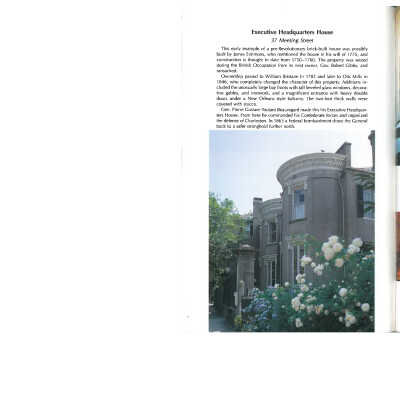 Constructed ca. 1760; altered 1840s. Charlestonian James Simmons is believed to have built 37 Meeting Street in 1760. As originally constructed, the house follows a formal Georgian plan with a center hall dividing the 4 principle rooms on each floor. At Simmons's death in 1775 the house became the home of Gov. Robert Gibbes. He and his family were forced to abandon the house during the British occupation of the city in the Revolutionary War and returned to find the house heavily damaged. In the next century, it became the home of builder and financier Otis Mills. It was during Mills's occupancy in the 1840s that the facade of the house was greatly altered with the addition of the 2 projecting bays that are joined on the second floor of the house with an ornate cast-iron balcony. In 1862, the house became the headquarters of Gen. Pierre G.T. Beauregard, the commander of the Confederate forces at Charleston. Beauregard occupied the house until Federal shelling in the area forced him to shift his operations to a less vulnerable position at the northern end of the city. (Poston, Buildings of Charleston.)
